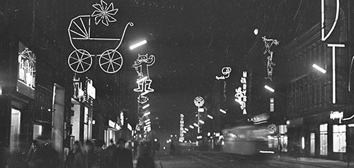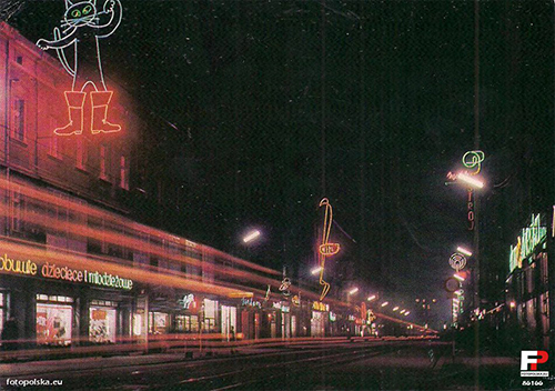 Niemal vis a vis elewację kamienicy u zbiegu ulic 3 Maja i Stawowej zdobiła reklama neonowa sklepu odzieży dziecięcej MARYSIA.