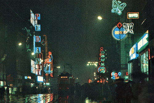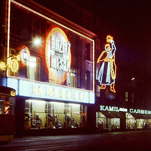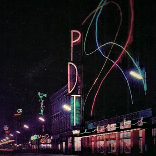 Pierwszy neon pojawił się na elewacji budynku w dniu otwarcia i był niewielkim trzyliterowym skrótowcem zamkniętym w okręgu. 14 lat później, na początku 1962 r., Przedsiębiorstwo Państwowe REKLAMA, które w tamtych czasach sprawowało monopol nad przygotowaniem i realizacją instalacji neonowych, zaprezentowało projekt i wykonało kolejną odsłonę reklamy PDT, widoczną na prezentowanej animacji.