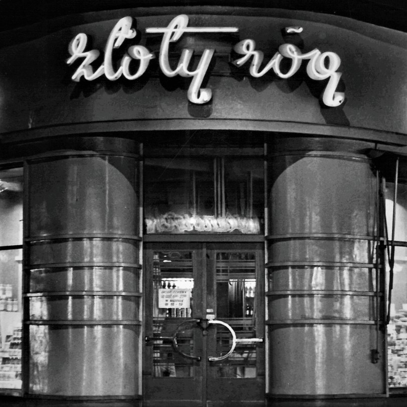 Kamienica na rogu ulic Holtzestrasse i Sedanstrasse, czyli dzisiejszych Mariackiej i Mielęckiego, powstała w 1901 r. Od początku parter budynku był przeznaczony na działalność handlową. Już przed II wojną światową mieściły się tu eleganckie delikatesy. Nazwa „Złoty róg” pojawiła się w latach 50., choć początkowo w nieco innej lokalizacji – na rogu dzisiejszych ulic Staromiejskiej i Dyrekcyjnej. Dopiero później lokal przeniesiono w docelowe miejsce. Prawdopodobnie też z tego okresu pochodzi stylizowany neon, który umieszczony był nad wejściem do lokalu. Po bokach znajdowały się mniejsze elementy świetlne: skrót nazwy właściciela delikatesów, PSS Społem oraz dekoracyjne nawiązania do asortymentu lokalu. Po zmianie ustroju w Polsce prywatni właściciele ze zmiennym szczęściem próbowali kontynuować najlepsze tradycje delikatesów.